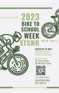 May 29 – June 2, 2023, Bike to School Week inspires students to try riding a bike to school for the first time, to learn new skills, or to just have fun, explore, and connect with people, the community, and nature. Scan the QR code below to sign up and win great prizes; have fun biking!