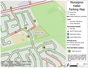 Student Transportation Services provided our community with the following map which shows safe areas to drop off or pick up your children. Offen Shea Crescent is jammed up with vehicular traffic and recently, some parents have been fined for stopping in front of the school. Consider dropping or picking up on a close by side street, where your child can walk to and from Haller.