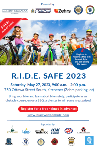 R.I.D.E. Safe is providing free bicycle helmets to children in Kitchener who cannot otherwise afford them thanks to our generous sponsors Mcleish Orlando and the City of Kitchener. Registration for a helmet is required. This event will be located in the parking lot of Laurentian Zehrs parking lot located at 750 Ottawa St S, Kitchener between 9am and 2pm. The event is free to attend and everyone is welcome.